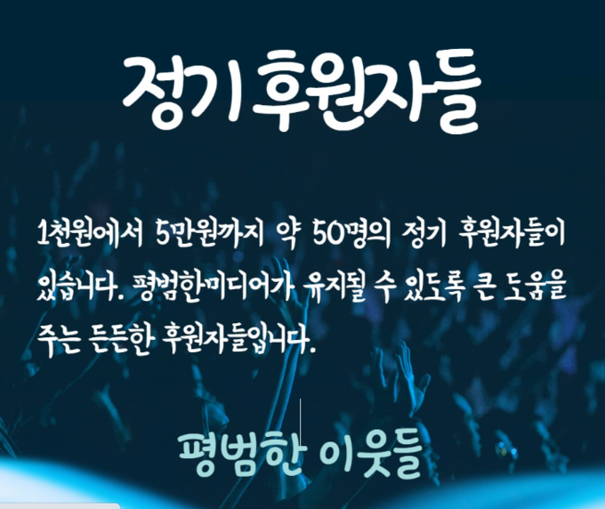 2021년 3월 이후 평범한미디어 창간 초기부터 소식을 듣고 50만원 이상 고액 후원을 해주신 분들이 3명이나 계십니다. 이분들의 도움을 잊지 않겠습니다. 정말 감사드립니다.