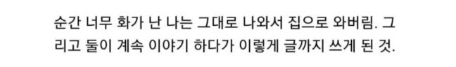 내가 전에 아주 안 좋게 끝난 전애인 겸 친구가 한 명 있는데 말야, 그 인간이 자기가 전주에 있는 자립생활주택에 살 때의 얘기를 해준 적이 있었다? 그때 시각장애인이 한 명 있었는데 뇌병변장애인인 그 인간이나 다른 사람이 고기를 구우면 불판에 있는 익지도 않은 고기를 허겁지겁 처먹느라 바쁘더래. 처음 한두 번이야 안 보이니까 그런다고 넘어갈 수 있지만 계속 그러니까 다들 빡칠 거 아냐. 결국 그 인간이 참다 참다 폭발해서 뒷통수를 한 대 후려갈겼대. 그러고 나서 “야 이 새끼야, 네가 사람 새끼냐! 네가 이렇게 다 처먹으면 다른 사람들은 뭐 먹냐?”라면서 말 그대로 개패듯 팼다는 거야. 그 인간한테 맞았다는 사람은 그 뒤로 식탐이 싹 고쳐져서 혼자 고기를 다 처먹는 일은 없어졌지만 “지금 같았으면 자립생활주택에서 장애인이 장애인 학대했다고 뉴스 나왔을 거야”라고 하면서 그 인간이 엄청 웃었던 기억이 나네.