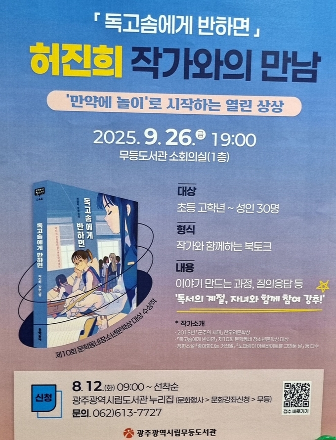 허진희 작가와의 만남은 지난 9월 26일 저녁 7시에 무등도서관 1층에서 이루어졌다. 허 작가가 쓴 <독고솜에게 반하면>이라는 책을 간략히 설명하자면 고등학교에서 일어나는 친구들과의 관계, 인간군상에 대해 다루고 있는 책이다. 관심이 생긴다면 한번 읽어보길 바란다. 이외에도 여러 가지 책들을 많이 출간했다.